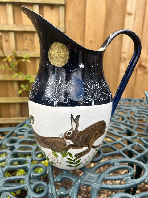 This jug is ceramic and covered with two coats of base primer as recommended by paint manufacturers. The background colour is carefully chosen to suit the particular design. The subjects are subsequently painted in acrylic to the level of detail I apply to my traditional paintings. After drying, the finishing and protection will be achieved by two coats of varnish, which brings out the colours even more.