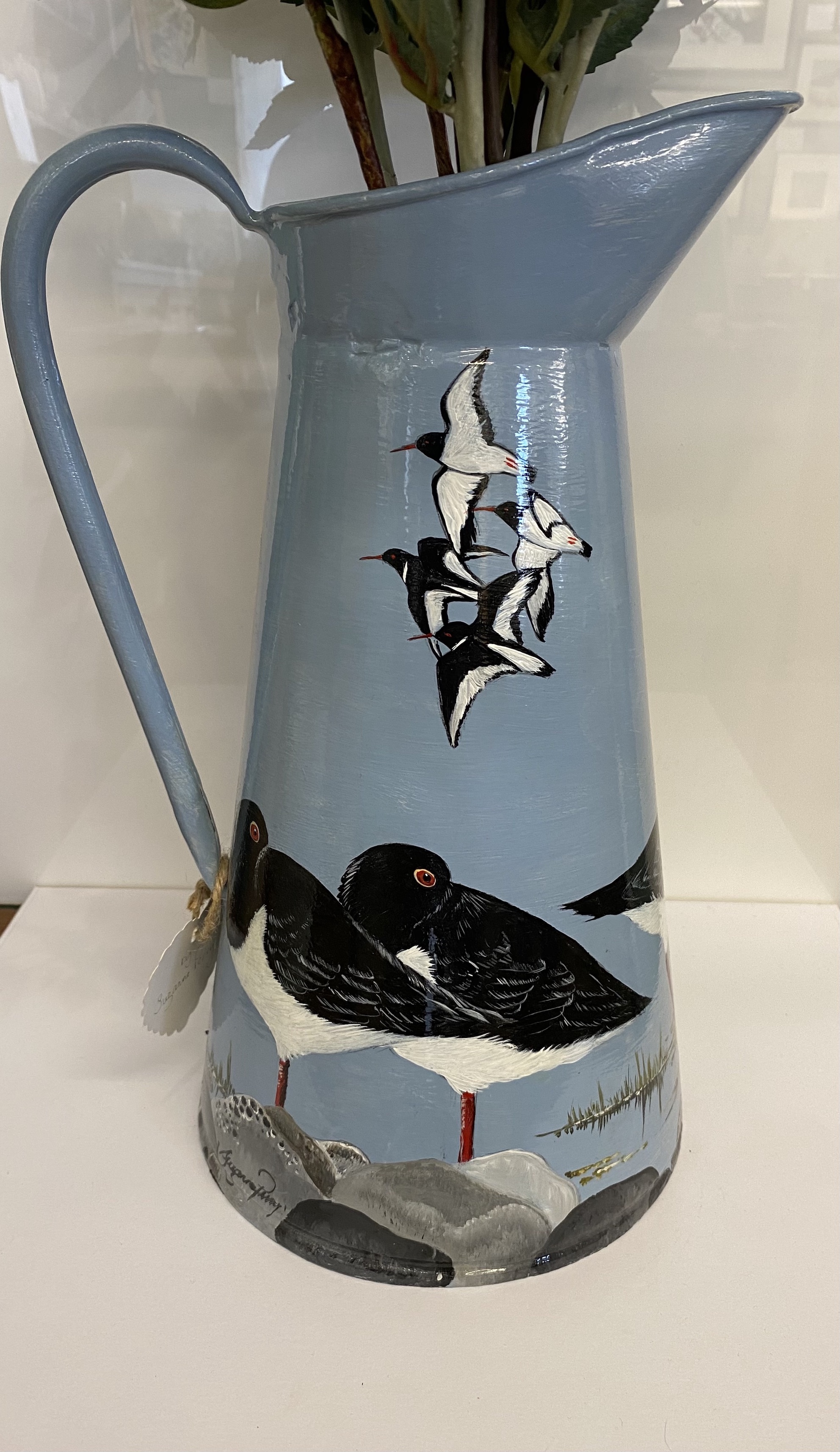 A vintage style curved jug with Oyster Catcher design, size typically 14" from base to spout. Each jug is individually sourced and the flowers are hand painted, with wrap round design. Ideal for flower displays or simply to be enjoyed as an unusual work of art in its own right.