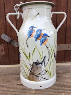 Vintage Aluminium Milk Churn, approximately 500mm tall with a hand painted Kingfishers theme, which is usually sourced from France. As well as providing a particularly unique feature piece at home, it can also double up as an indoor umbrella or walking stick stand. Two designs on each churn, four aspects on view.
