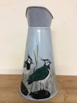 A vintage jug with Lapwings design, size typically 12" from base to spout.  Each jug is individually sourced and the birds are hand painted, with wrap round design.  Ideal for flower displays or simply to be enjoyed as an unusual work of art in its own right. My jugs are usually made of enamel, tre ...Read more