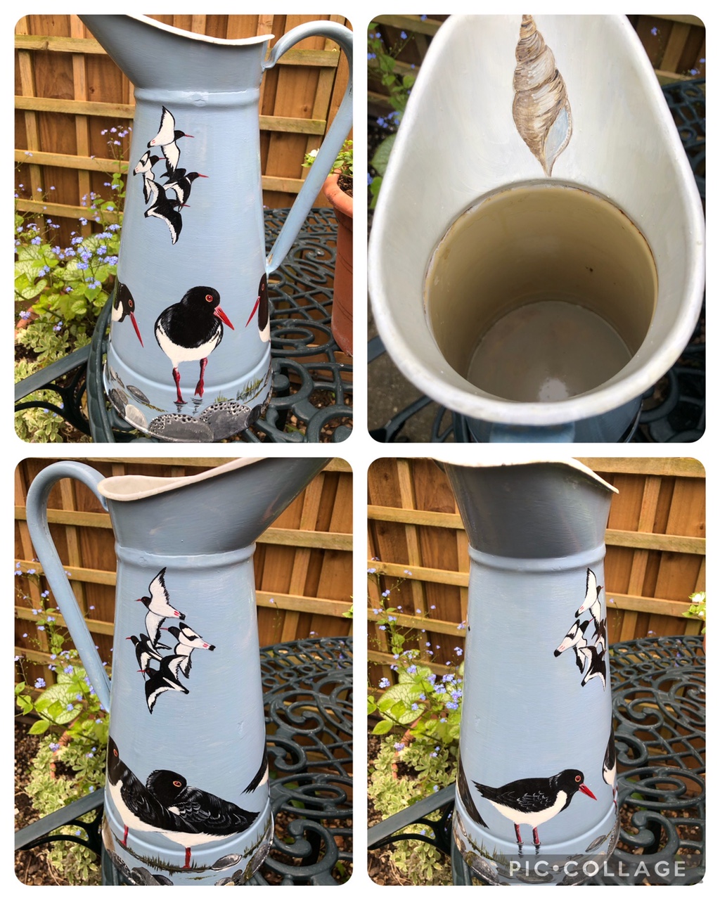 A vintage jug with Oyster Catcher design, size typically 15" from base to spout. Each jug is individually sourced and the birds are hand painted, with wrap round design. Ideal for flower displays or simply to be enjoyed as an unusual work of art in its own right.