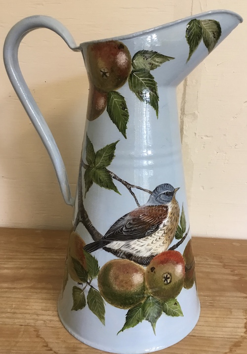 A vintage jug with Fieldfare design, size typically 10"-11" from base to spout. Each jug is individually sourced and the birds are hand painted, with wrap round design. Ideal for flower displays or simply to be enjoyed as an unusual work of art in its own right.