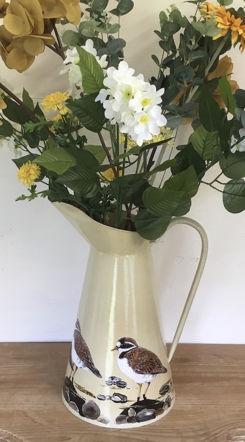 A vintage jug with Ringed Plovers design, size typically 14" from base to spout. Each jug is individually sourced and the birds are hand painted, with wrap round design. Ideal for flower displays or simply to be enjoyed as an unusual work of art in its own right.