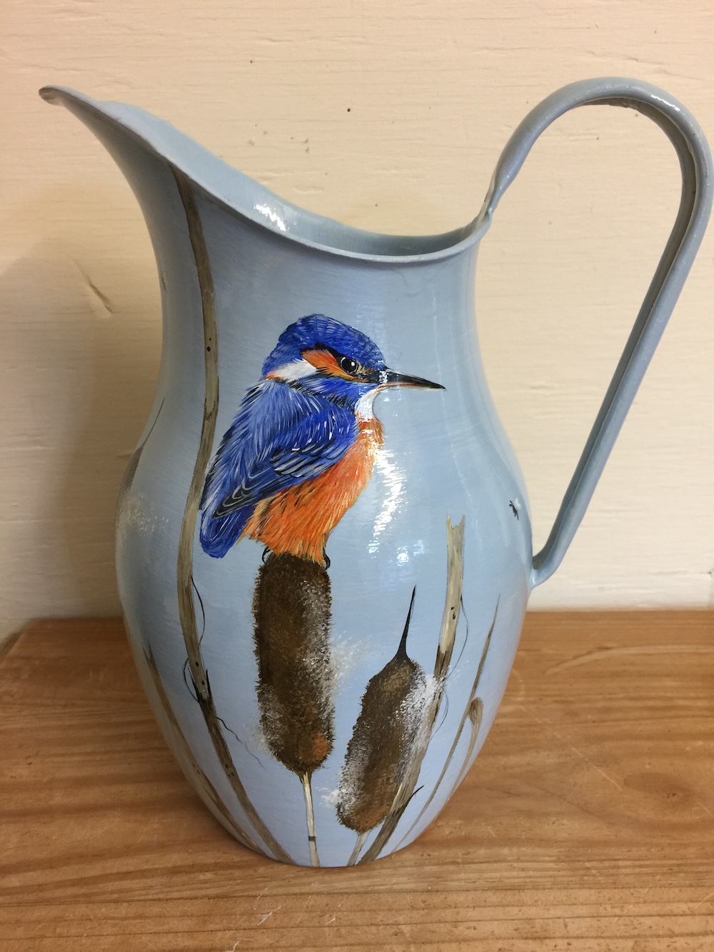 My jugs are usually made of enamel and covered with two coats of base primer as recommended by paint manufacturers. The background colour is carefully chosen to suit the particular design. The birds are subsequently painted in acrylic to the level of detail I apply to my traditional paintings. After drying, the finishing and protection will be achieved by two coats of varnish, which brings out the colours even more.