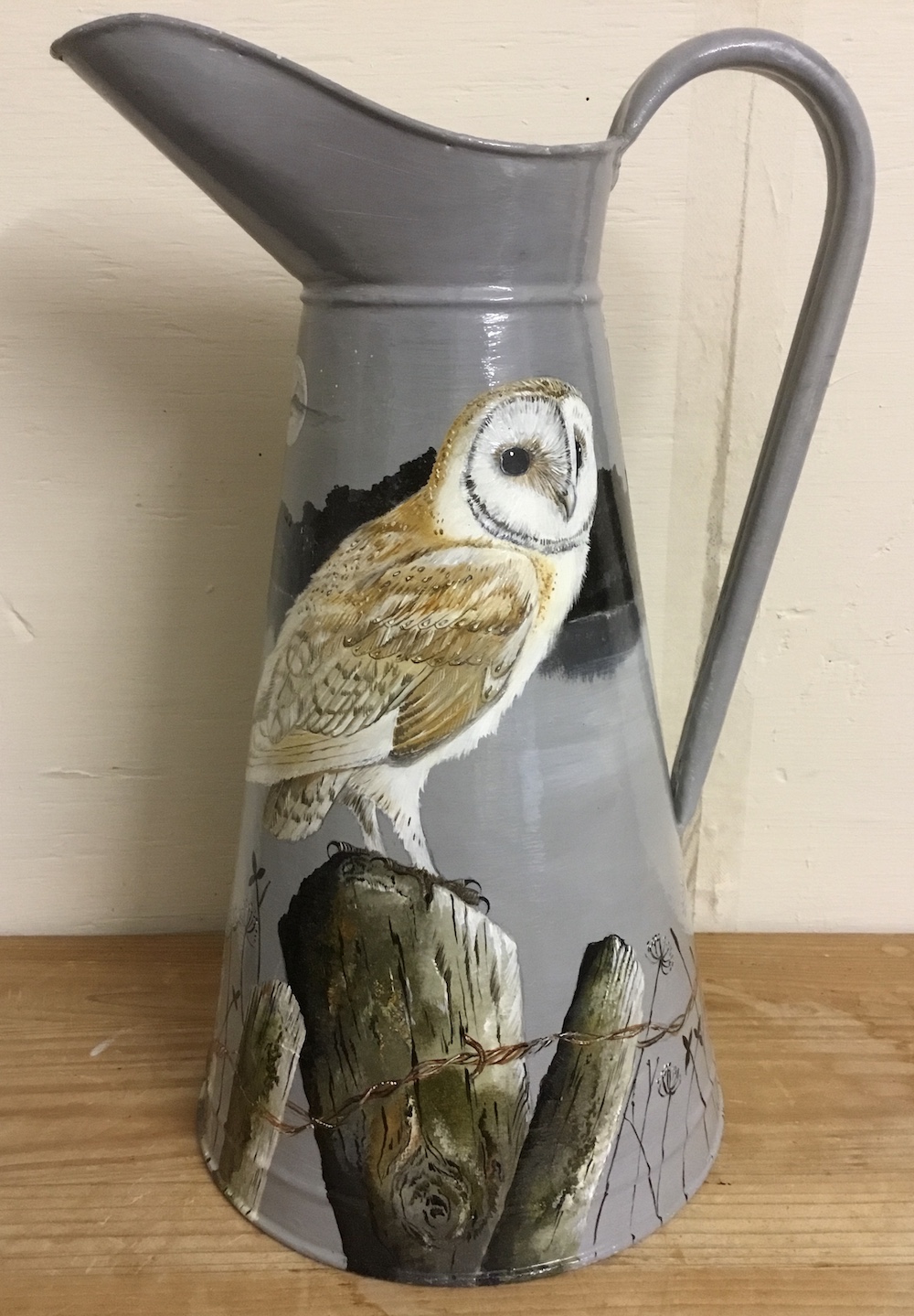 A vintage jug with Barn Owl design, size typically 16" from base to spout. Each jug is individually sourced and the birds are hand painted, with wrap round design. Ideal for flower displays or simply to be enjoyed as an unusual work of art in its own right.