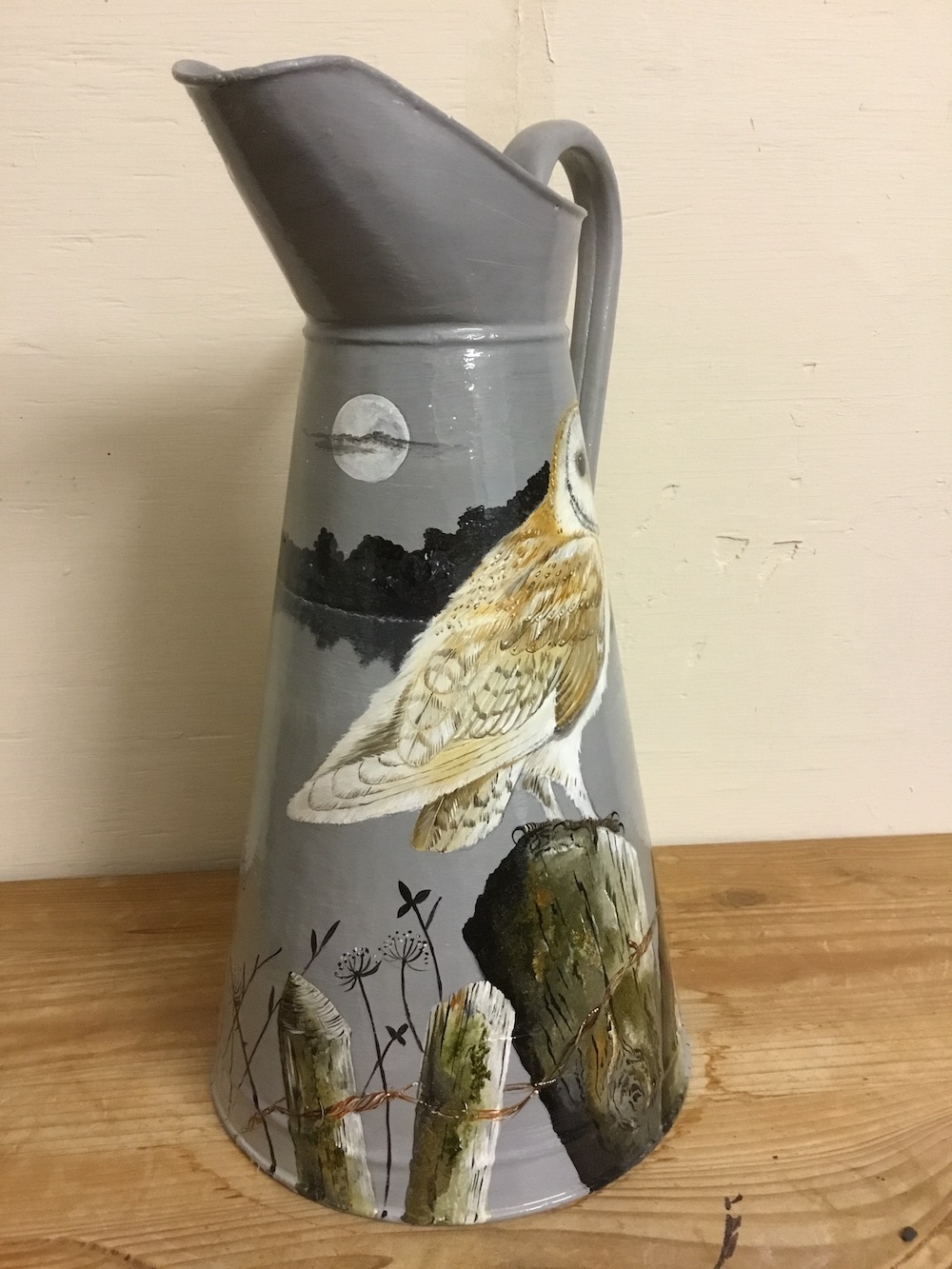A vintage jug with Barn Owl design, size typically 16" from base to spout.  Each jug is individually sourced and the birds are hand painted, with wrap round design.  Ideal for flower displays or simply to be enjoyed as an unusual work of art in its own right. My jugs are usually made of enamel, tre ...Read more