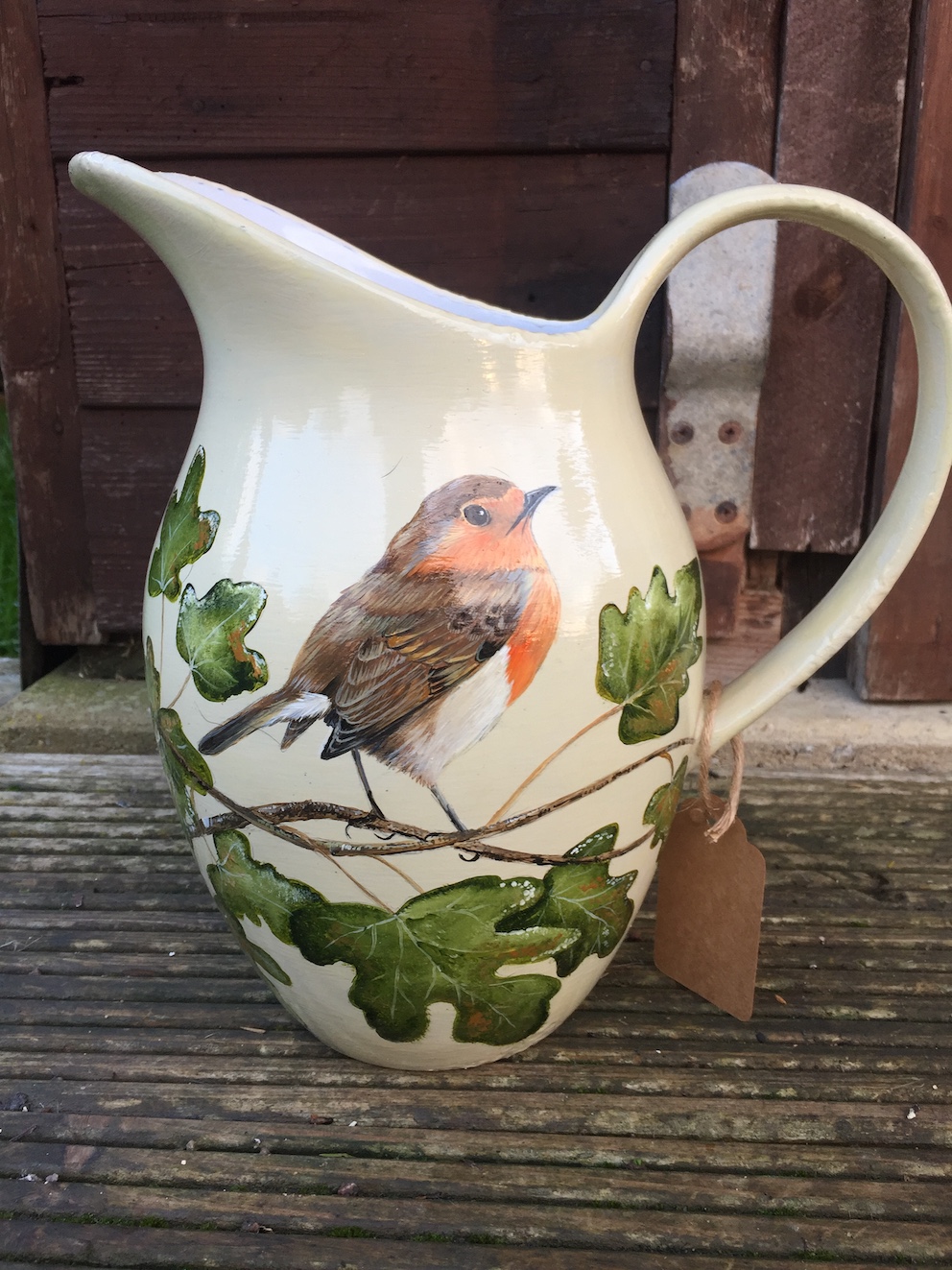 A vintage style curved jug with Robin design, size typically 9"-10" from base to spout. Each jug is individually sourced and the birds are hand painted, with wrap round design. Ideal for flower displays or simply to be enjoyed as an unusual work of art in its own right.