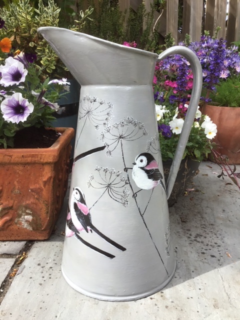 A vintage jug with Long Tailed Tits design, size typically 14" from base to spout. Each jug is individually sourced and the birds are hand painted, with wrap round design. Ideal for flower displays or simply to be enjoyed as an unusual work of art in its own right.