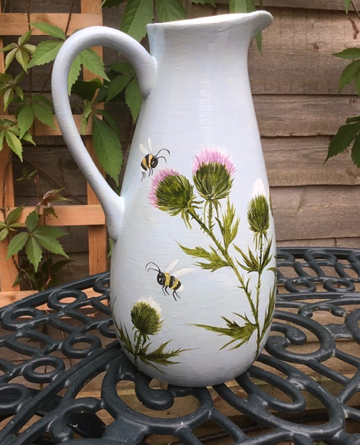 A vintage style curved jug with Thistles design, size typically 9.5" from base to spout. Each jug is individually sourced and the thistles and bees are hand painted, with wrap round design. Ideal for flower displays or simply to be enjoyed as an unusual work of art in its own right.
