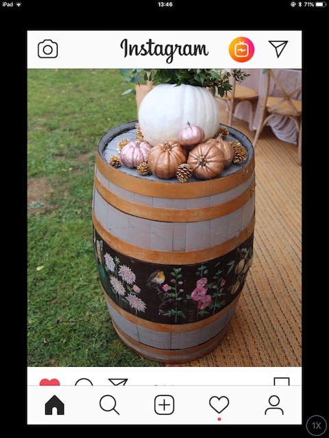 Our beautiful wedding barrels are out to bring happiness on this moody day. Suzanne Perry Art has done an amazing job on the old barrels I gave her. Looking gorgeous, adorned with our home grown pumpkins and dahlias.