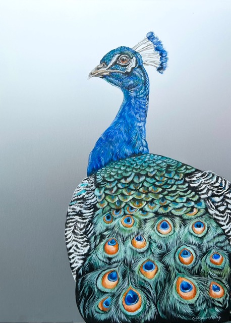 Acrylic Original on Aluminium    Size 16" x 12" This Peacock design is on a 3mm aluminium panel, which is an anodised surface, widely considered the best process for the application of acrylic paint. There is no residue from the process, which effectively changes the structure of the aluminium abo ...Read more