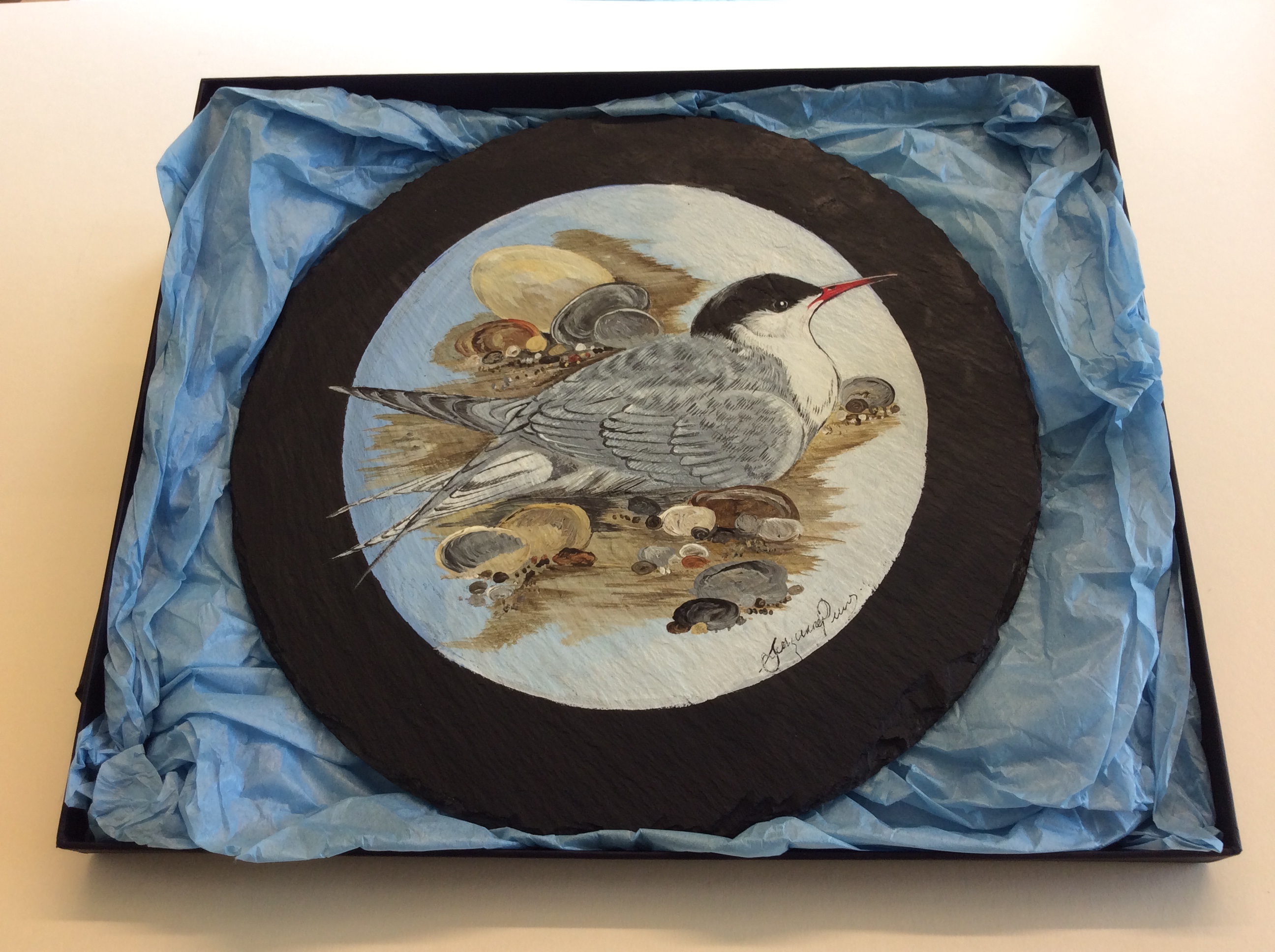 Hanging bird art slates, this one with a Common Tern design, are mainly quarried in the UK and the birds hand painted in acrylic.  Ideal for hanging on a wall where domestic space is more limited or for displaying in a separate stand.  They come in a toned-in tissue wrap, sitting in a black presenta ...Read more