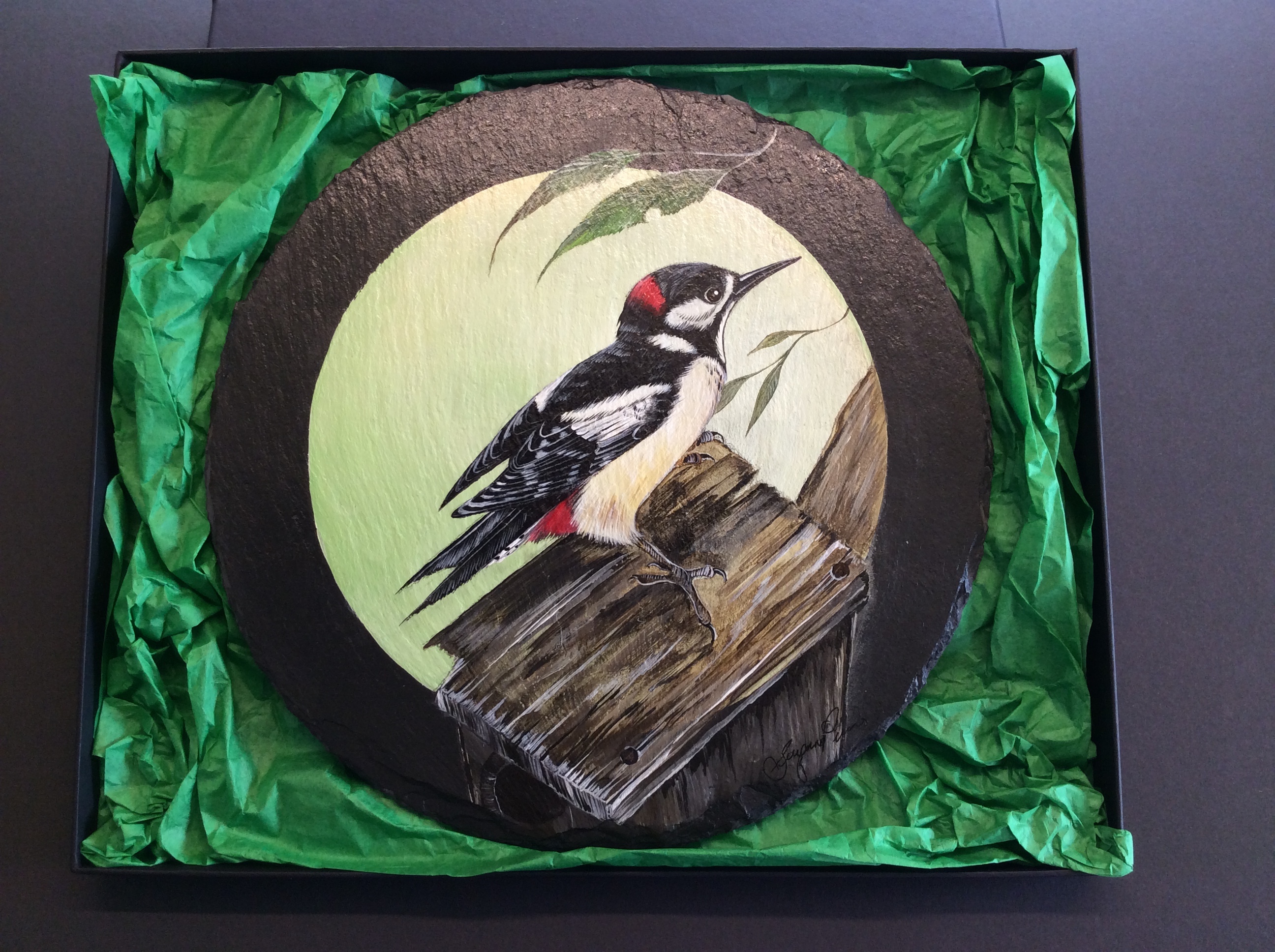 Hanging bird art slates, this one with a Woodpecker design, are mainly quarried in the UK and the birds hand painted in acrylic.  Ideal for hanging on a wall where domestic space is more limited or for displaying in a separate stand.  They come in a toned-in tissue wrap, sitting in a black presentat ...Read more