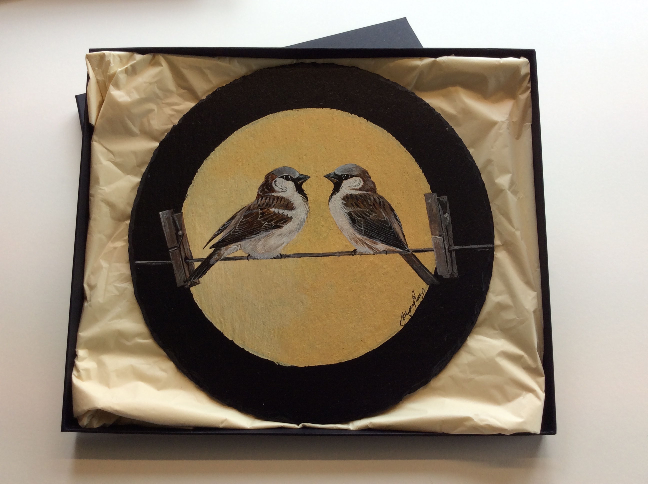 Hanging bird art slates, this one with a House Sparrows design, are mainly quarried in the UK and the birds hand painted in acrylic.  Ideal for hanging on a wall where domestic space is more limited or for displaying in a separate stand.  They come in a toned-in tissue wrap, sitting in a black prese ...Read more