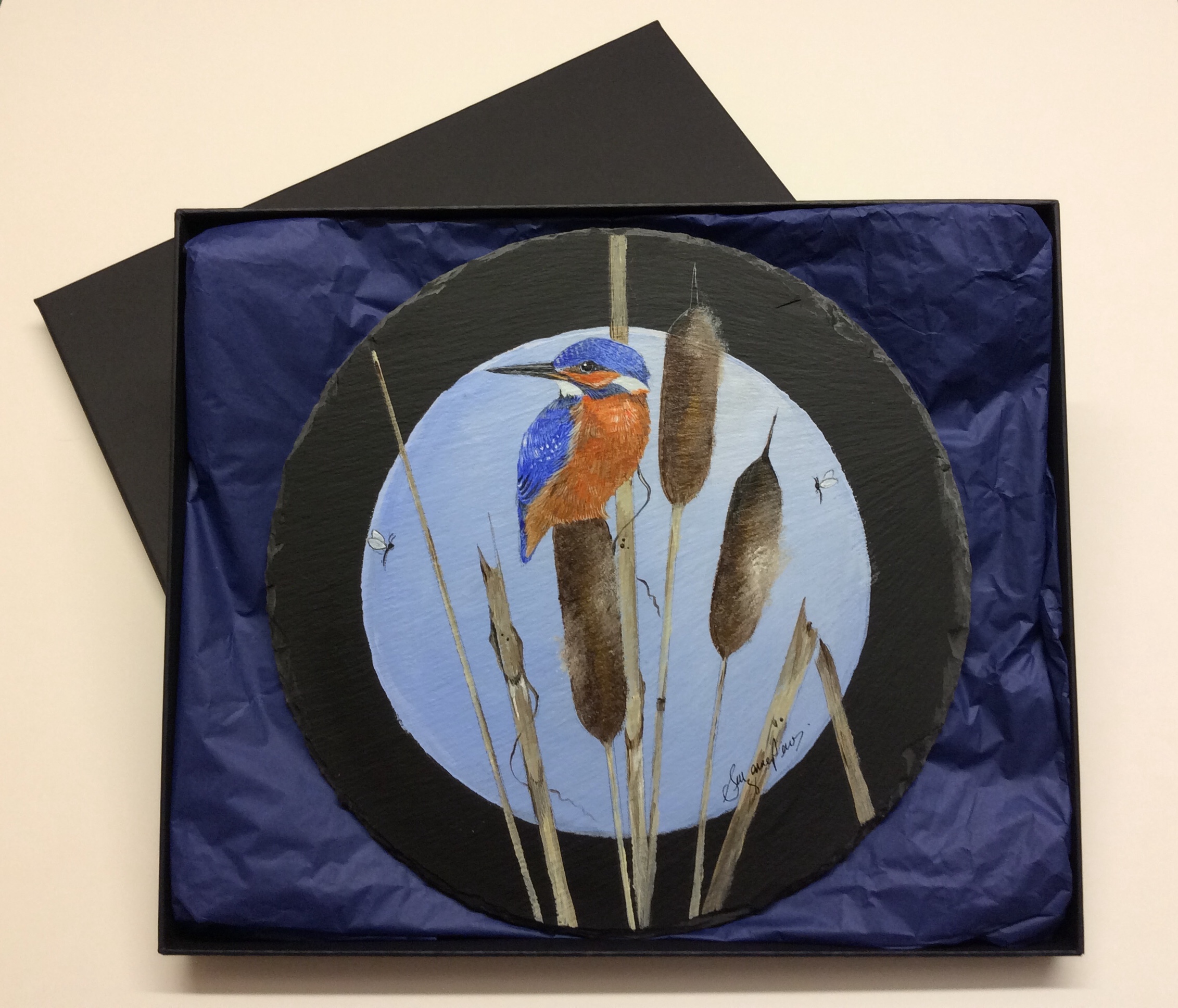 Hanging bird art slates, this one with a Kingfisher in Bullrushes design, are mainly quarried in the UK and the birds hand painted in acrylic.  Ideal for hanging on a wall where domestic space is more limited or for displaying in a separate stand.  They come in toned-in tissue wrap, sitting in a black presentation box.