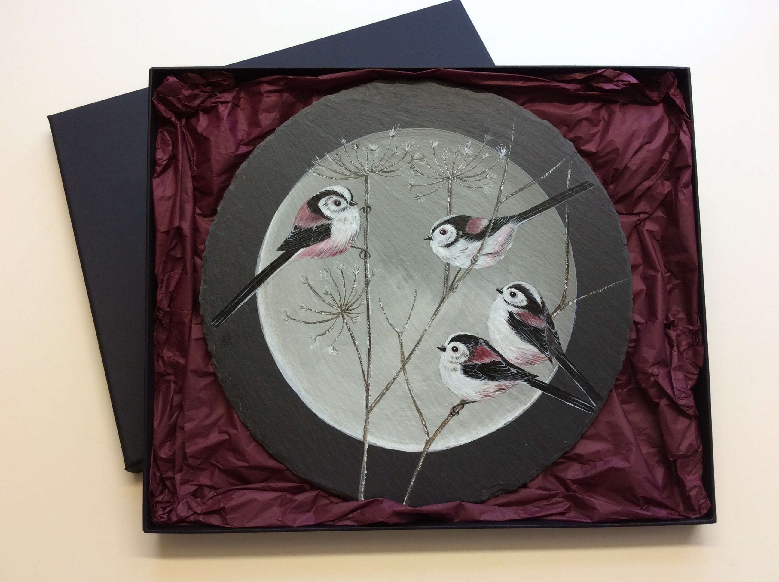 Hanging bird art slates, this one with a Long Tailed Tits design, are mainly quarried in the UK and the birds hand painted in acrylic. Ideal for hanging on a wall where domestic space is more limited or for displaying in a separate stand. They come in toned-in tissue wrap, sitting in a black presentation box.