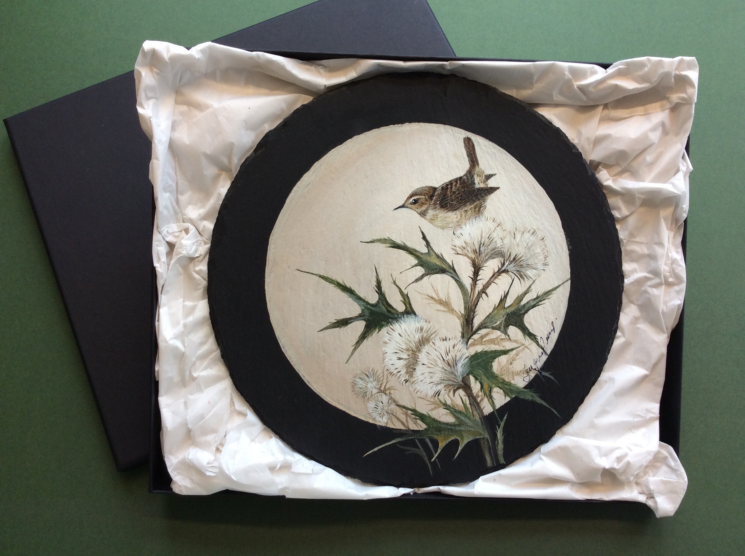 Hanging bird art slates, this one with a Wren on Thistle design, are mainly quarried in the UK and the birds hand painted in acrylic.  Ideal for hanging on a wall where domestic space is more limited or for displaying in a separate stand.  They come in toned-in tissue wrap, sitting in a black presen ...Read more