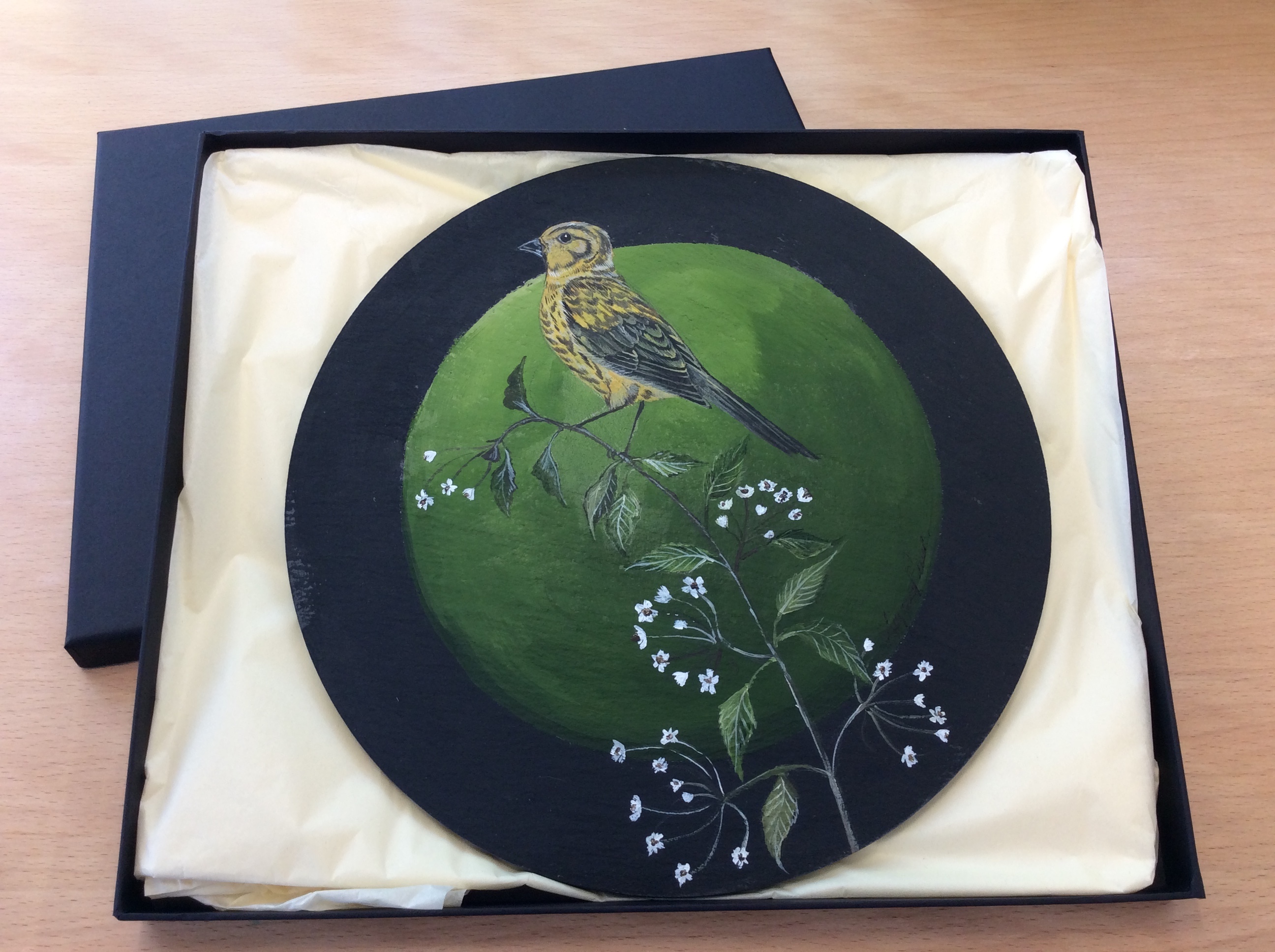 Hanging bird art slates, this one with a Yellowhammer design, are mainly quarried in the UK and the birds hand painted in acrylic.  Ideal for hanging on a wall where domestic space is more limited or for displaying in a separate stand.  They come in toned-in tissue wrap, sitting in a black presentat ...Read more
