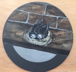 Hanging bird art slates, this one with another Swift design, are mainly quarried in the UK and the birds hand painted in acrylic.  Ideal for hanging on a wall where domestic space is more limited or for displaying in a separate stand.  They come in a toned-in tissue wrap, sitting in a black presentation box.
