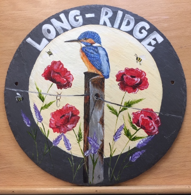 Hanging bird art slates, this one with a Kingfisher design, are mainly quarried in the UK and the birds hand painted in acrylic. Ideal for hanging outside the house with the numbest or name of the residence within the painting. They come in toned-in tissue wrap, sitting in a black presentation box.