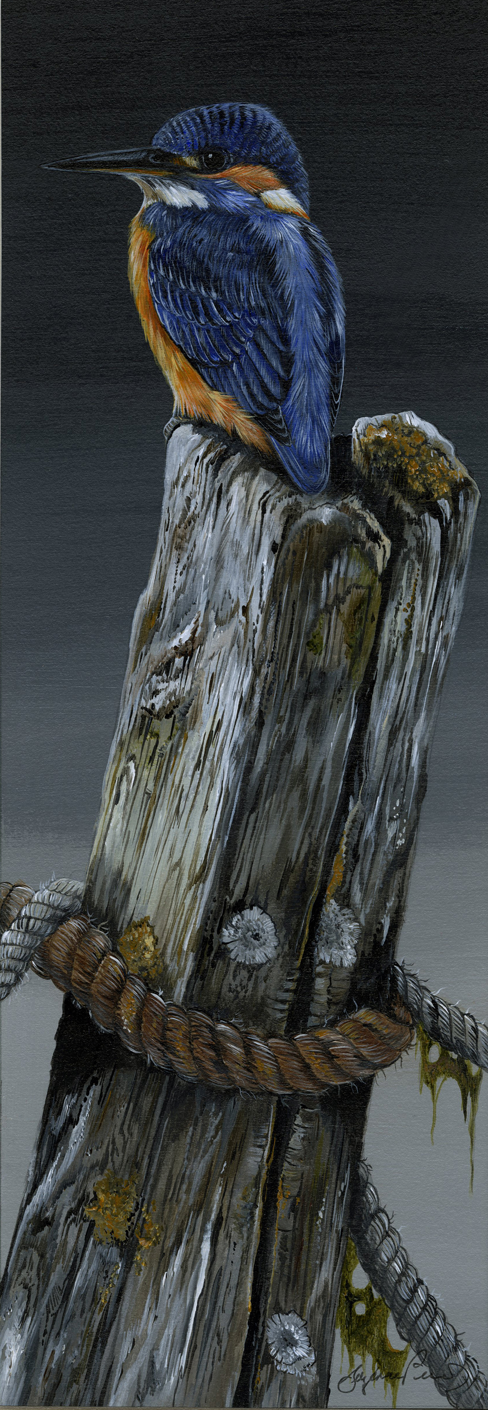 Framed size 21" x 9", with non reflective glass. My night time Kingfisher.... The painting is on Cold Press, extra heavy, off white Crescent art board and I aim to produce the finest detail in both the subject and its natural setting. The shade of the Daler mountboard is carefully selected depending on the painting, as is the toning of the frame itself. SOLD at Brett Gallery, Monks Eleigh.