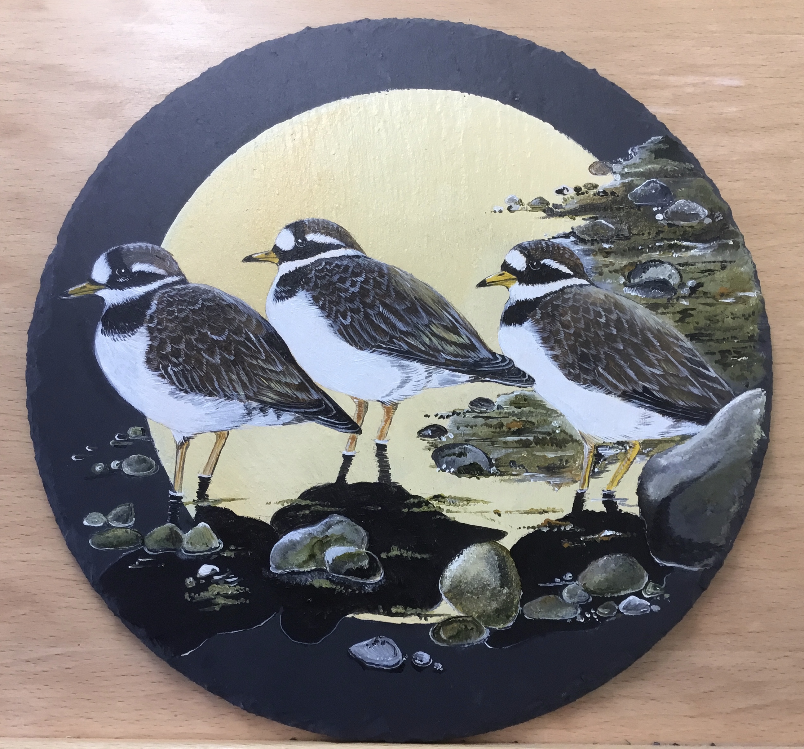 Hanging bird art slates, this one with a Ringed Plovers design, are mainly quarried in the UK and the birds hand painted in acrylic. Ideal for hanging on a wall where domestic space is more limited or for displaying in a separate stand. They come in toned-in tissue wrap, sitting in a black presentation box.