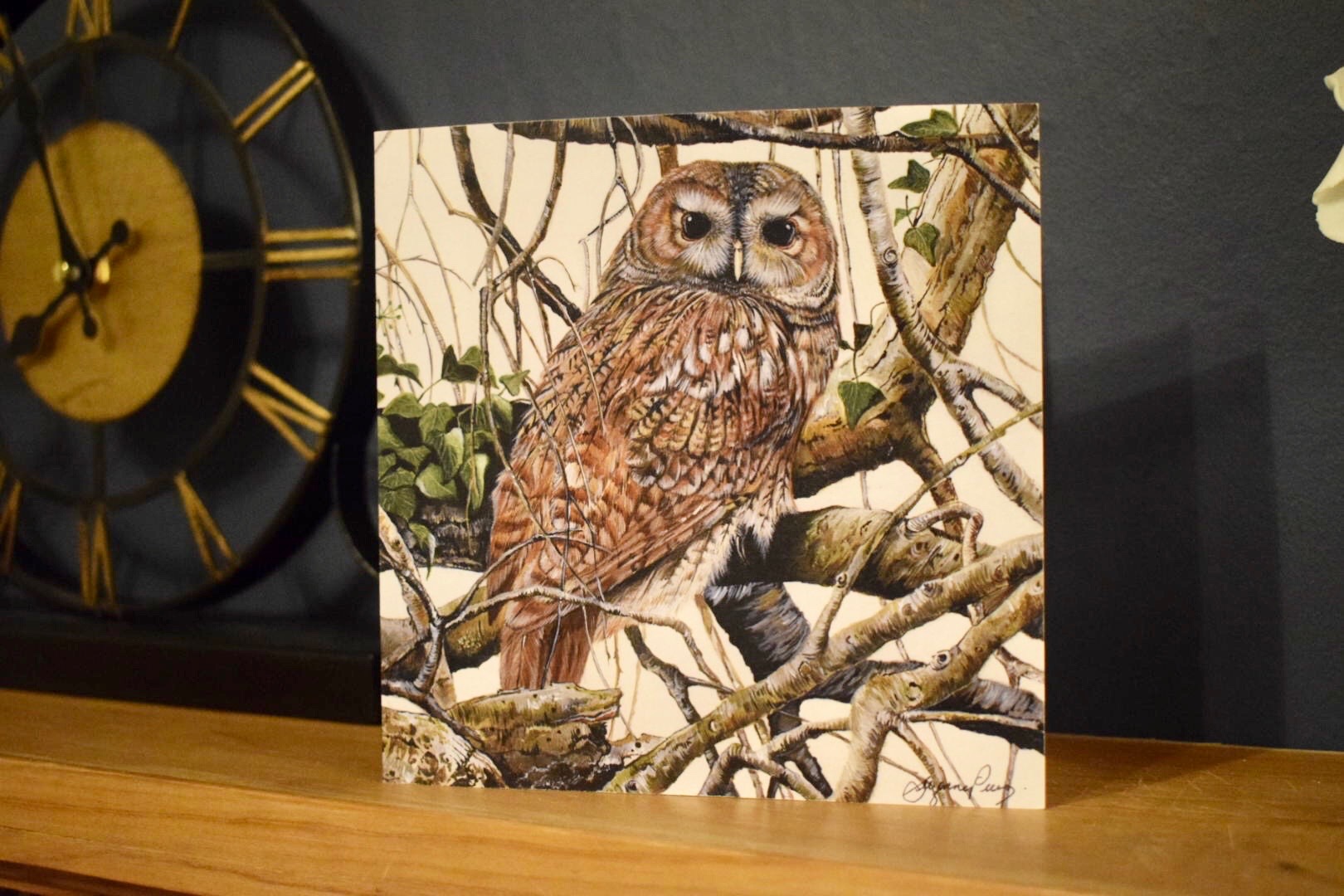 My paintings lend themselves to being used for notelet cards and here is a Tawny Owl in 6" x 6" on bright white, stiff, matte 350gsm card in brown ribbed envelopes, enclosed in cellophane bags.  The card is Forest Stewardship Certified.