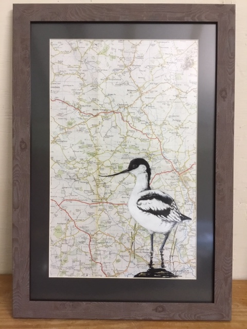 Framed 18" x 12", with non reflective glass.  The Avocet is hand painted in acrylic on an Ordnance Survey Map, this example being of South Suffolk.  Any combination of bird or geographical background may be chosen depending on the love of a particular species or your association with a part of the country.  Or both! The price will vary within the range of £130 to £175 depending on the number of birds involved.