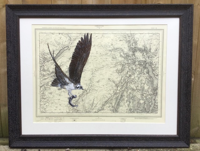 Framed 24" x 18", with non reflective glass. The Osprey is hand painted in acrylic on an Ordnance Survey Map, this example being of The Lake District. Any combination of bird or geographical background may be chosen depending on the love of a particular species or your association with a part of the country. Or both! The price will vary within the range of £150 to £195 depending on the number of birds involved.