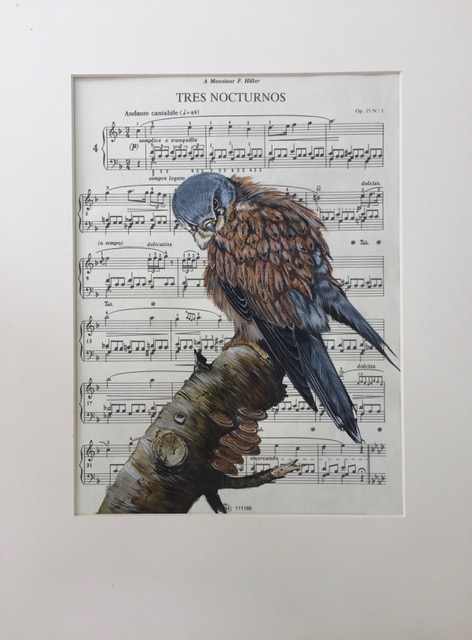 I have painted my Kestrel on to vintage sheet music paper and I think it is quite effective.   In this example it fits comfortably in a 16" x 12" frame, using my usual non reflective glass.  The options are almost endless in terms of choice of bird and sheet music and, provided the latter can be sourced, any combination could be chosen.  Other frame sizes would be possible. Price may vary depending on choice of subject detail and frame size