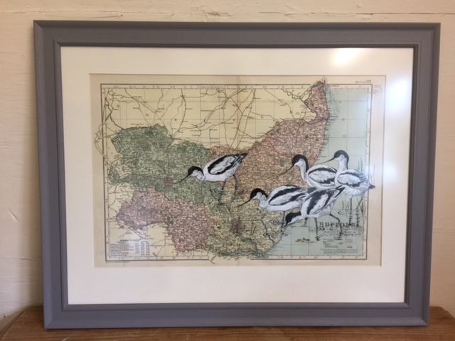 The Avocet is hand painted in acrylic on an Ordnance Survey Map, this example being of Suffolk. Any combination of bird or geographical background may be chosen depending on the love of a particular species or your association with a part of the country. Or both!