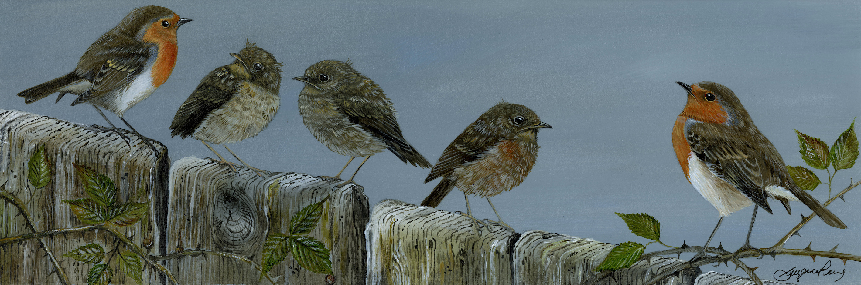 Framed 9" x 21", with non reflective glass, or mounted 6" x 17" Rarely close together, our garden friendly robins' giclee acrylic print is bought as one of a limited 25 print run.
