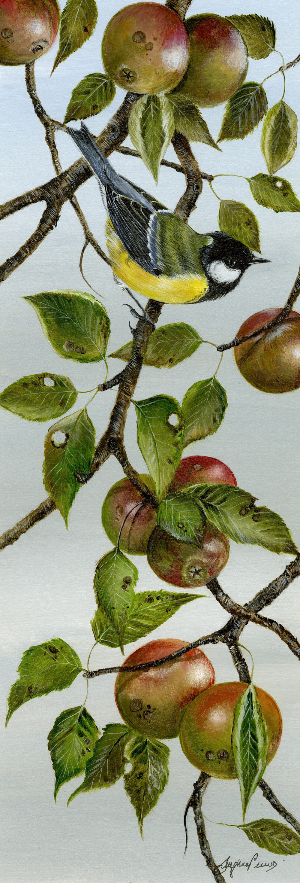 Framed 21" x 9", with non reflective glass, or mounted 17" x 6". The Great Tit in an apple tree, aptly named Fearn's Pippin, this giclee acrylic print is one of a limited 25 print run.