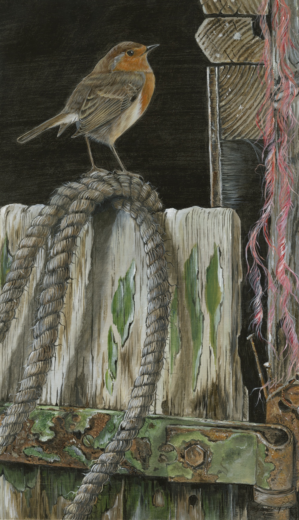 Framed 18" x 12", with non reflective glass, or mounted 14" x 9".  Night time robin, perched on old rope, peeping in to the shed. The giclee acrylic print is one of a limited 25 print run.