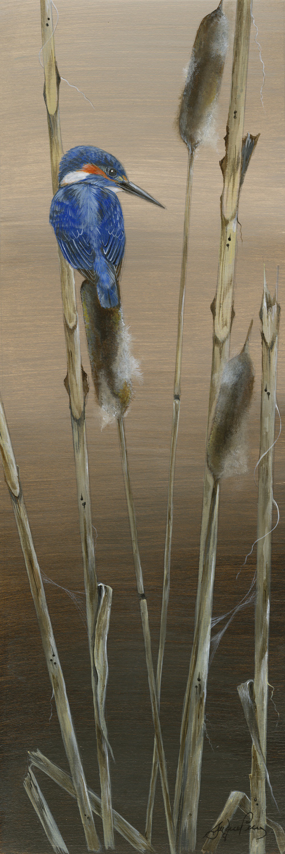 Framed 21" x 9", with non reflective glass, or mounted 17" x 6"  I aimed to capture the mood of this evening painting of the kingfisher.  It has now exhausted its limited 25 print run. Kingfishers are vulnerable to habitat degradation through pollution or unsympathetic watercourses manageme ...Read more