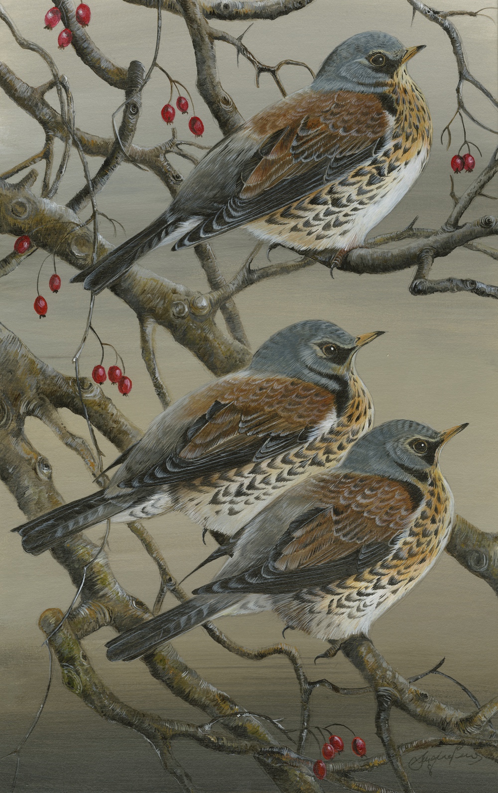 Framed 18" x 12", with non reflective glass, or mounted 14" x 9".   Fieldfares are sociable birds and these three are available as a giclee acrylic print and is one of a limited 25 print run.