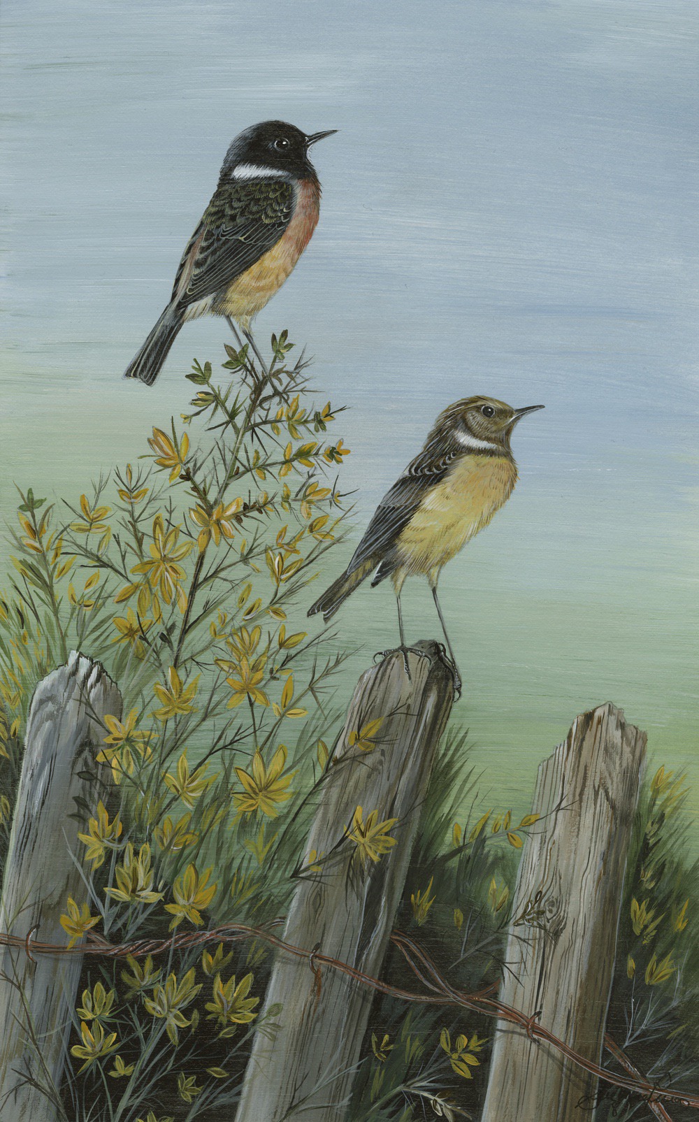 Framed 18" x 12", with non reflective glass, or mounted 14" x 9"  Two Stonechats on fence and gorse are shown in this giclee acrylic print which is one of a limited 25 print run.