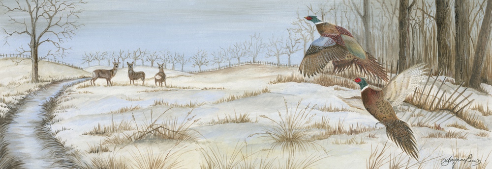 Framed 9" x 21", with non reflective glass, or mounted 6" x 17" In flight, my Pheasant giclee acrylic print is one of a limited 25 print run.
