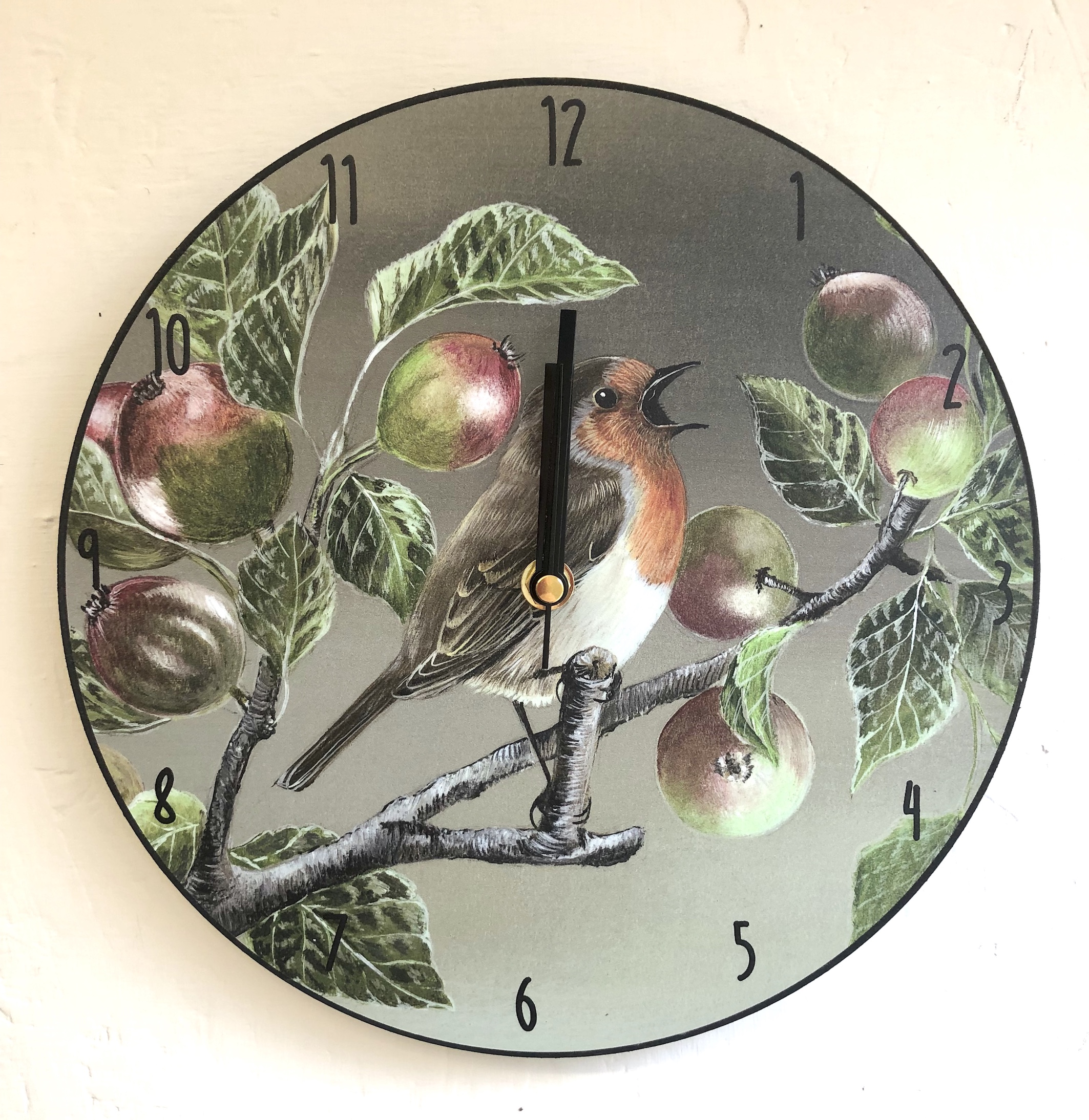 This wooden Rustic Robin bird clock is 250mm diameter from 6mm thick wood with black metal hands and integrated hanger. Made in Britain. Boxed with instructions, and quartz sturdy mechanism requiring 1 x AA battery.
