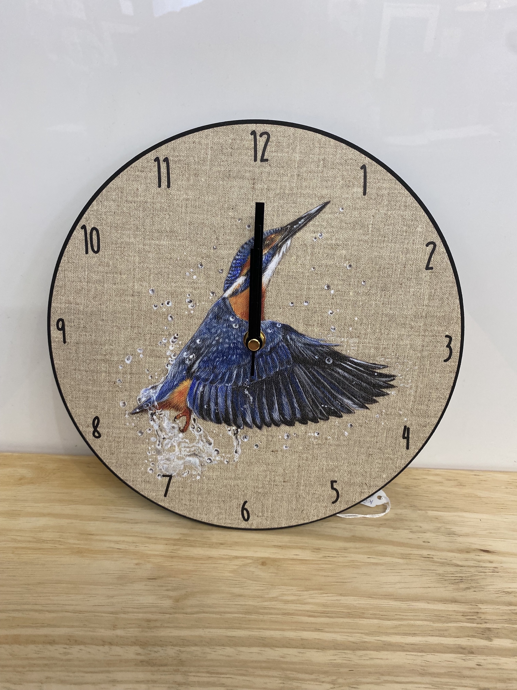 This wooden Rustic Kingfisher bird clock is 250mm diameter from 6mm thick wood with black metal hands and integrated hanger. Made in Britain. Boxed with instructions, and quartz sturdy mechanism requiring 1 x AA battery.