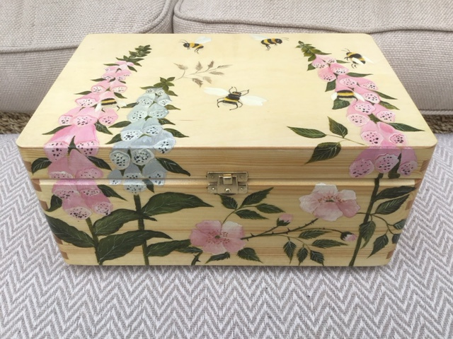 A wooden hand painted Keepsake Box ( L=270mm  W=140mm  D=200mm) with Bees on Foxglove design on the top and front.  Ideal for many home, work or hobby purposes combining usefulness with a beautiful piece of art.