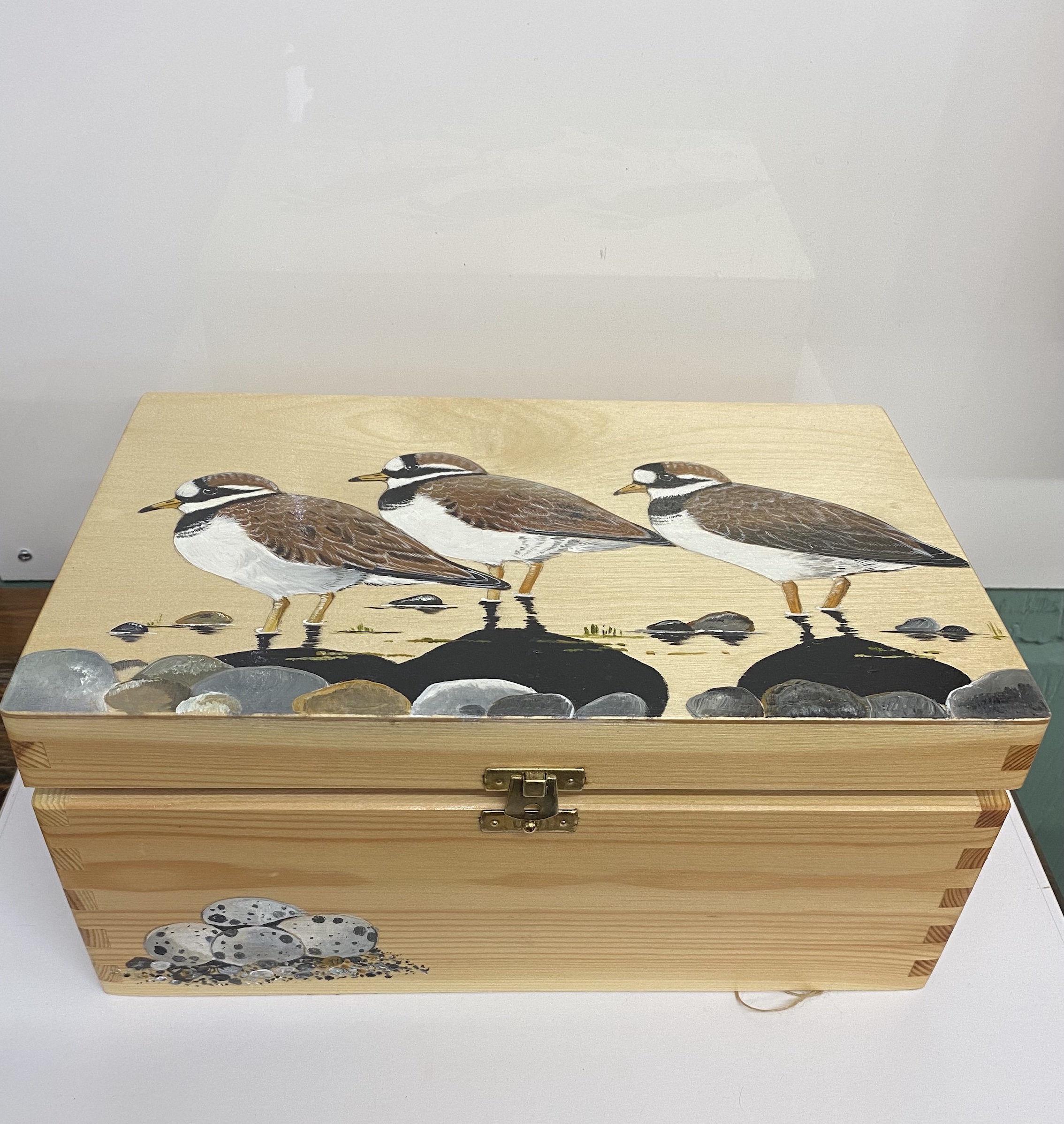 A wooden hand painted Keepsake Box ( L=270mm W=140mm D=200mm) with a Ringed plovers design. Ideal for many home, work or hobby purposes combining usefulness with a beautiful piece of art.