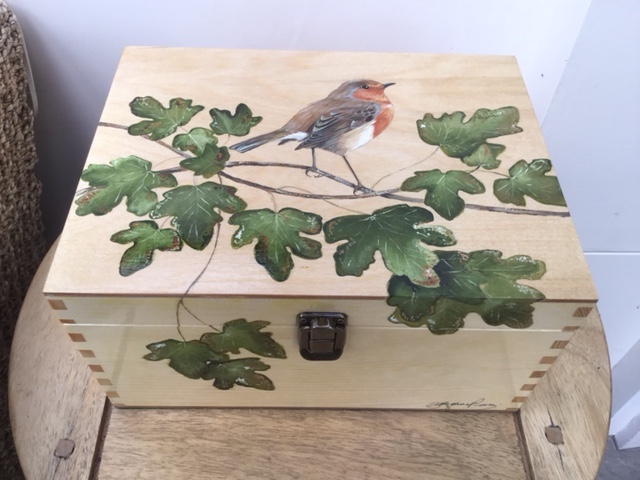 A wooden hand painted Keepsake Box ( L=270mm  W=140mm  D=200mm) with a Robin design on top and front.  Ideal for many home, work or hobby purposes combining usefulness with a beautiful piece of art.