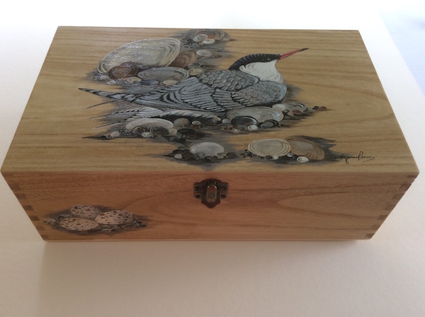 A wooden hand painted Keepsake Box ( L=270mm  W=140mm  D=200mm) with a Common Tern design on top and front.  Ideal for home, work or hobby purposes combining usefulness with a beautiful piece of art.