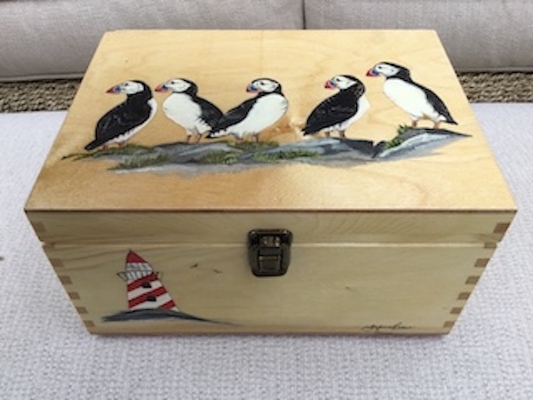 A wooden hand painted Keepsake Box ( L=270mm  W=140mm  D=200mm) with a Puffins design on top and front.  Ideal for many home, work or hobby purposes combining usefulness with a beautiful piece of art. The pine boxes are sanded until smooth enough for acrylics.  Each design is carefully created on t ...Read more