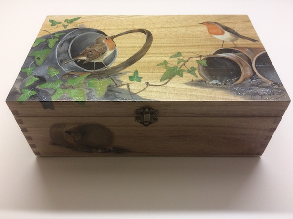 A wooden hand painted Keepsake Box ( L=270mm W=140mm D=200mm) with another Robin design on top and front. Ideal for many home, work or hobby purposes combining usefulness with a beautiful piece of art.