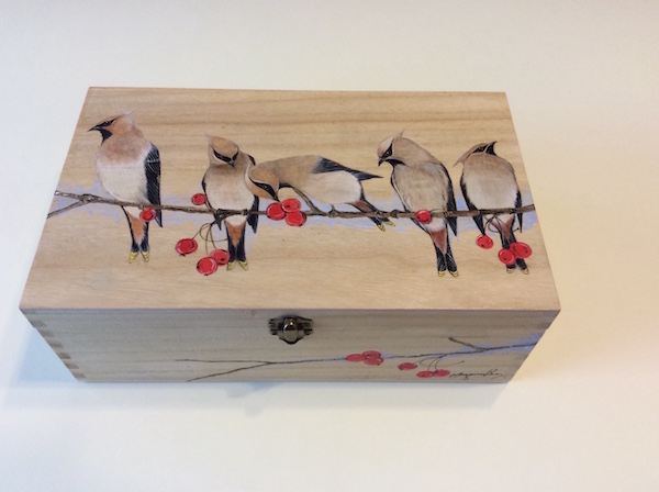A wooden hand painted Keepsake Box ( L=270mm  W=140mm  D=200mm) with another Waxwings design on top and front.  Ideal for many home, work or hobby purposes combining usefulness with a beautiful piece of art.