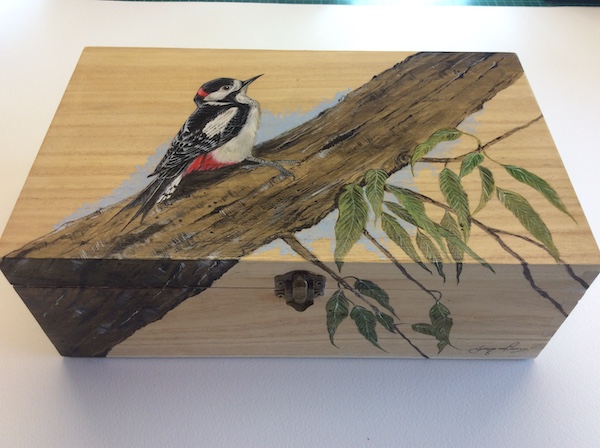 A wooden hand painted Keepsake Box ( L=270mm W=140mm D=200mm) with a Woodpecker design on top and front. Ideal for many home, work or hobby purposes combining usefulness with a beautiful piece of art.
