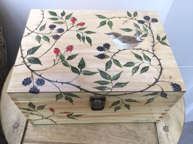 A wooden hand painted Keepsake Box ( L=270mm  W=140mm  D=200mm) with another Wren design on the top and front.  Ideal for home, work or hobby purposes combining usefulness with a beautiful piece of art.