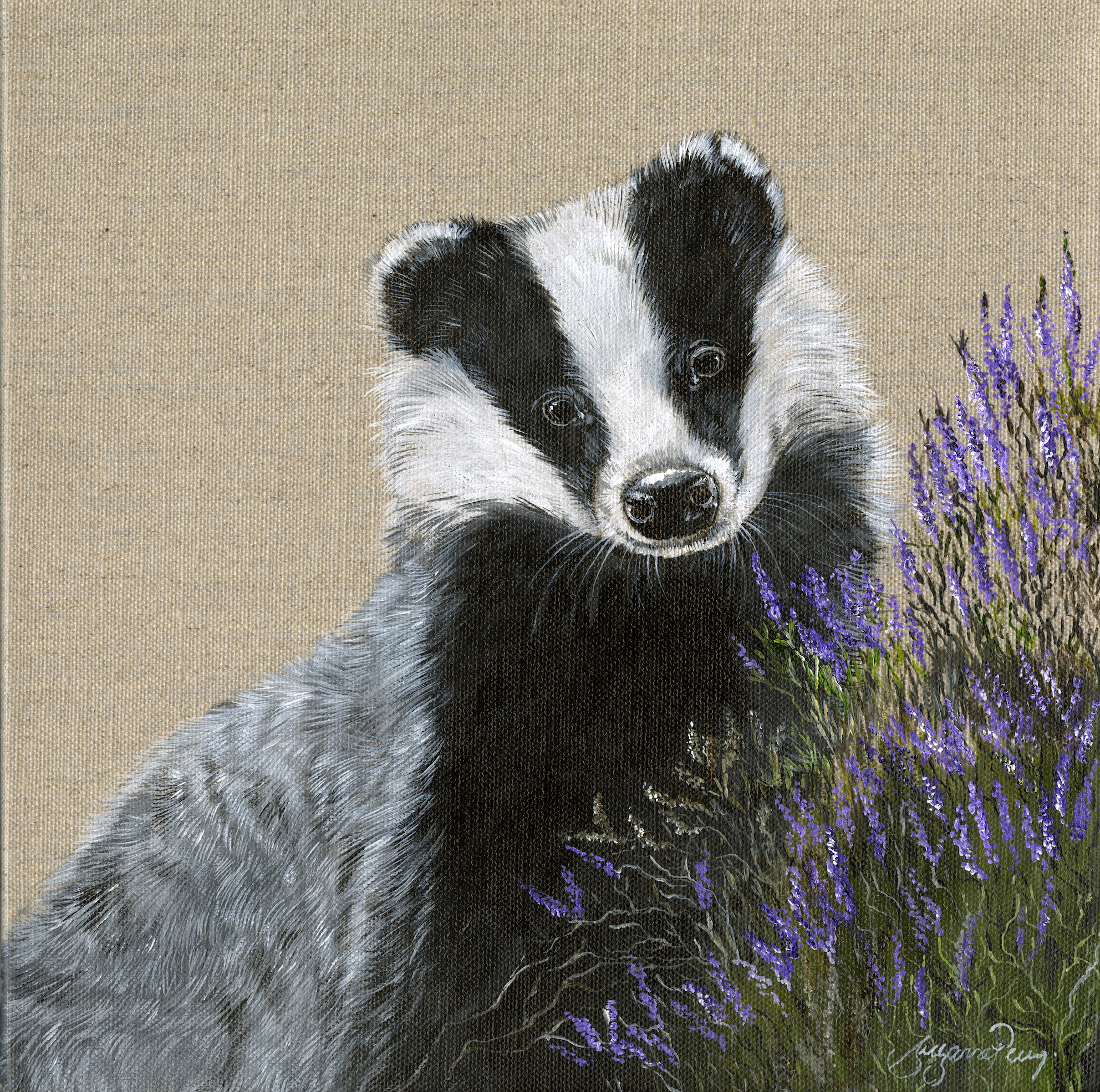 This Badger design is on Loxley clear primed linen canvas board. The linen fabric is laminated on to rigid, high quality medium density fibre board, which suits my style of painting perfectly. The texture is obviously very different from the Crescent Board that I have been using for a long time and I am pleased how easily it has been to adapt. The look of the linen seems to complement my style of painting.